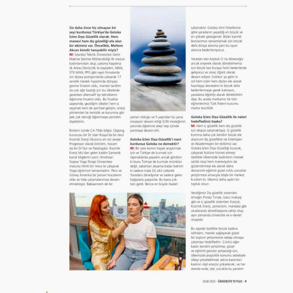 Hem iç güzellik hem dış güzellik için ekipçe çalışmaktayız. İç güzellik kısmına daha çok kendim bizzat ele alıyorum dış güzellikte ise Estetisyen ve Akademisyen bir ekibimiz var. Goloka İçten Dışa Güzelliği kurarak, çalışarak bütüne hizmet etmeyi özellikle ülkemizde kadınların meslek sahibi olup hem maneviyatını da güçlendirmeyi ele alarak daha donanımlı eğitimli güzel ruhlu çocuklar yetiştirmesi amacıyla böyle bir merkez kurdum ki, ülkemiz daha aydın bir topluk olsun. Verdiğimiz Dış güzellik sistemleri örneğin Protez Tırnak, kalıcı makyaj gibi ve iç güzellik sistemleri Koçluk, Kozmik Enerji, şamanizm , mandala gibi uluslararası akreditasyona sahip olup, aynı zamanda üniversite ve e-devlet onaylıdır. Bu sayede özellikle birçok kadına istihdam, meslek sağlayarak güzel bir toplum yetişmesine sebep olmaya çalışmayı hedefledim. Çünkü eğer kadın kendini yetiştirirse, güzel ve eğitimli gençler yetişeceği için, ülkemizde jeopolitik konumu sebebiyle ülkeyi yönetebilmek adına bastırılan kadının dişil enerjisi yükselecek, ve her alanda evde, işte, çocukta bu yaratım enerjisi artacak, daha aydın, eşine iyi davranan şiddetsiz, kültürlü eğitimli erkek ve kadın toplumlar yetişecek.