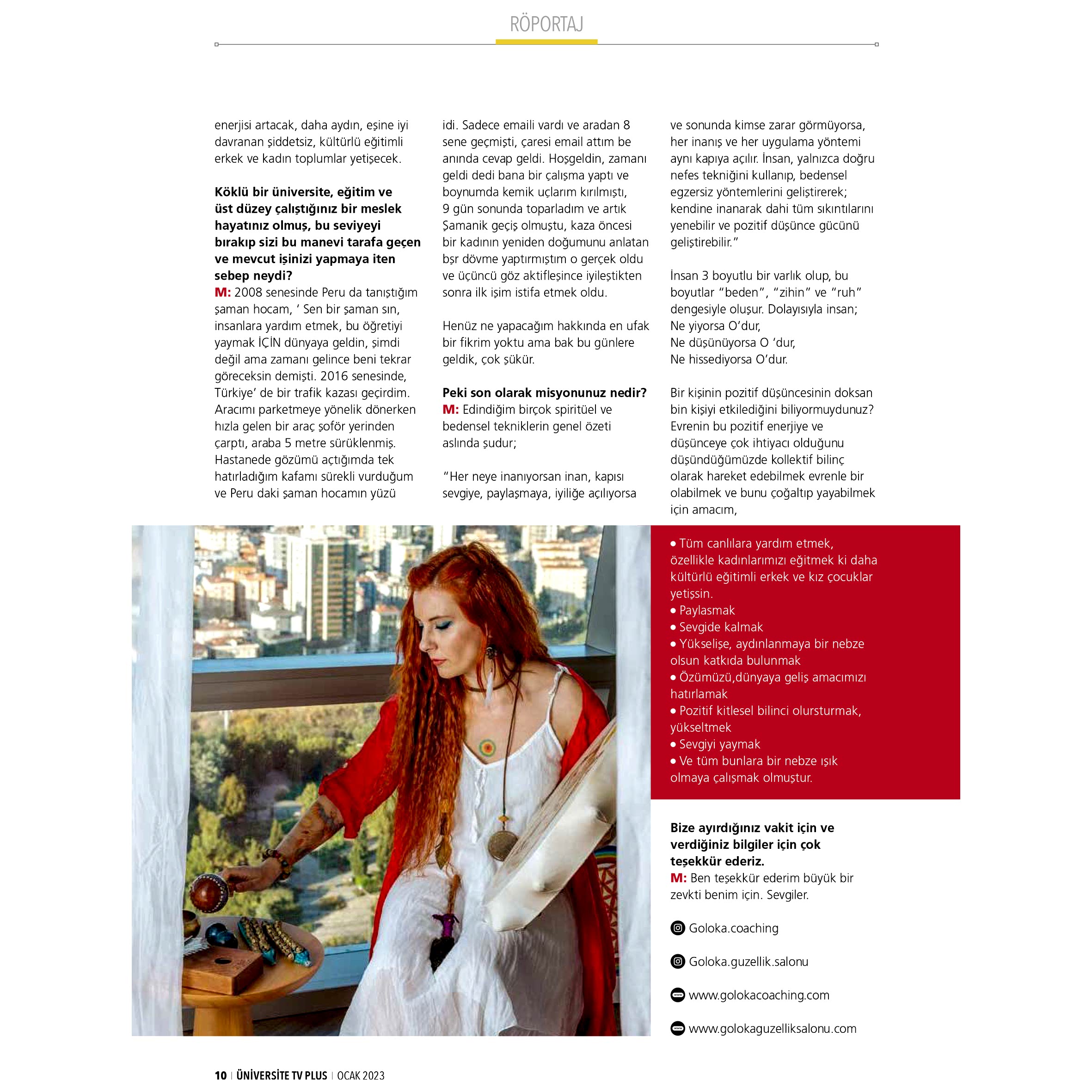 2008 senesinde Peru da tanıştığım şaman hocam, ‘ Sen bir şaman sın, insanlara yardım etmek, bu öğretiyi yaymak İÇİN dünyaya geldin, şimdi değil ama zamanı gelince beni tekrar göreceksin demişti. 2016 senesinde, Türkiye’ de bir trafik kazası geçirdim. Aracımı parketmeye yönelik dönerken hızla gelen bir araç şoför yerinden çarptı, araba 5 metre sürüklenmiş. Hastanede gözümü açtığımda tek hatırladığım kafamı sürekli vurduğum ve Peru daki şaman hocamın yüzü idi. Sadece emaili vardı ve aradan 8 sene geçmişti, çaresi email attım ve anında cevap geldi. Hoşgeldin, zamanı geldi dedi bana bir çalışma yaptı ve boynumda kemik uçlarım kırılmıştı, 9 gün sonunda toparladım ve artık Şamanik geçiş olmuştu, kaza öncesi bir kadının yeniden doğumunu anlatan bir dövme yaptırmıştım o gerçek oldu ve üçüncü göz aktifleşince iyileştikten sonra ilk işim istifa etmek oldu. Henüz ne yapacağım hakkında en ufak bir fikrim yoktu ama bak bu günlere geldik, çok şükür.